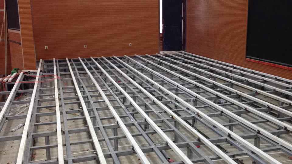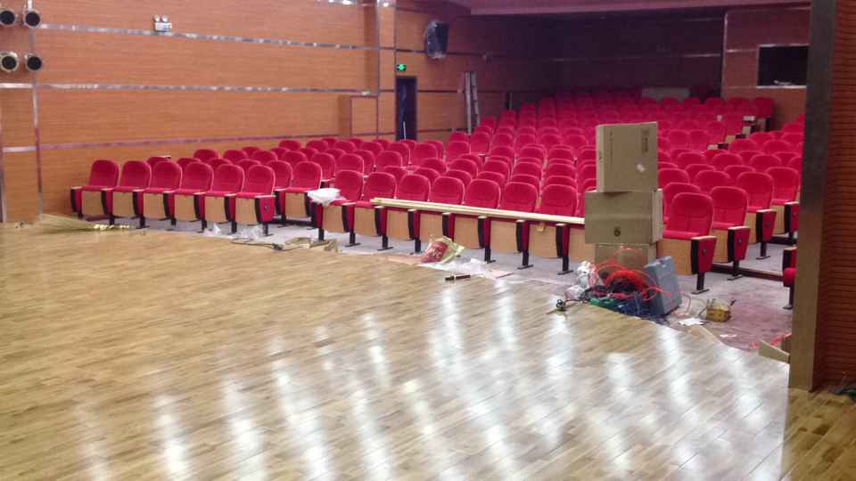 舞臺地板用材,面層為柞木,單層龍骨結構,鋪裝面積為103平方米。